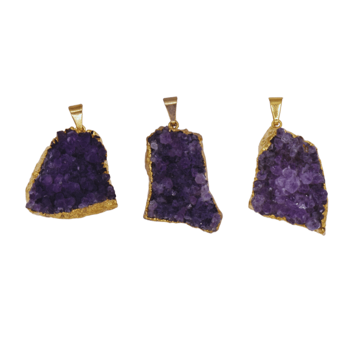 A hand-selected amethyst cluster pendant featuring sparkling crystal points and deep violet color. Lightweight and eye-catching for everyday wear.